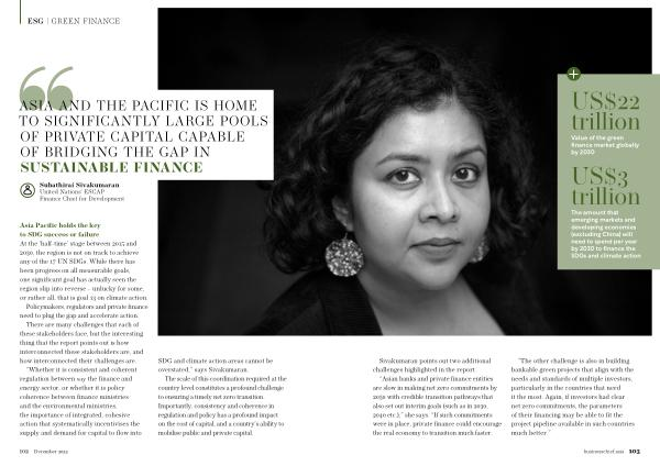 “ The other challenge is also in building bankable green projects that align with the needs and standards of multiple investors , particularly in the countries that need it the most . Again , if investors had clear net zero commitments , the parameters of their financing may be able to fit the project pipeline available in such countries much better .” businesschief . asia 103