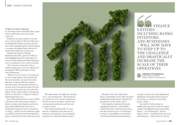 “ Asia and the Pacific is home to significantly large pools of private capital capable of bridging the gap in sustainable finance ,” says Sivakumaran . “ Private finance entities – including banks , investors , and businesses – will now have to step up