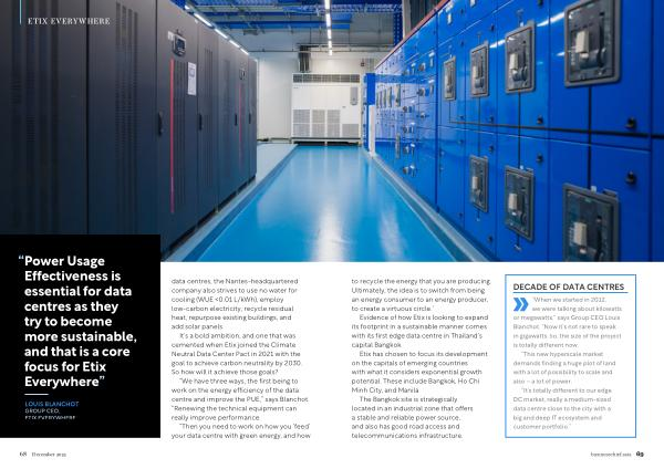 LOUIS BLANCHOT GROUP CEO , ETIX EVERYWHERE data centres , the Nantes-headquartered company also strives to use no water for cooling ( WUE < 0.01 L / kWh ), employ low-carbon electricity , recycle residual heat , repurpose existing buildings , and add solar panels .